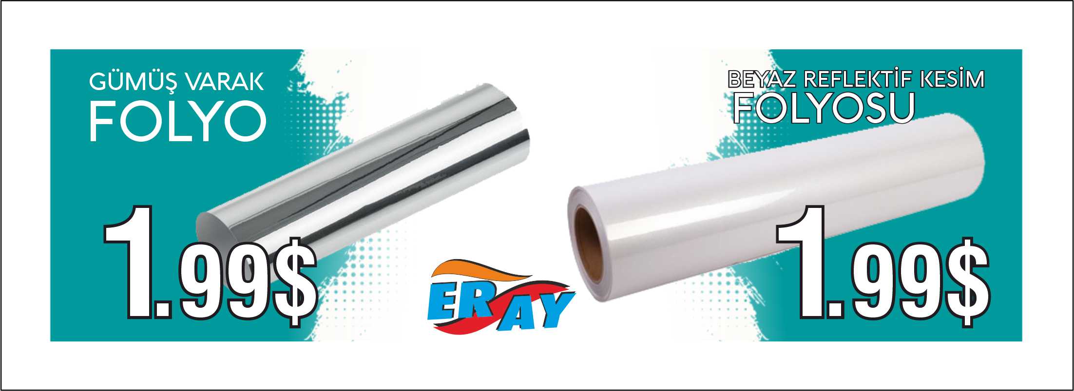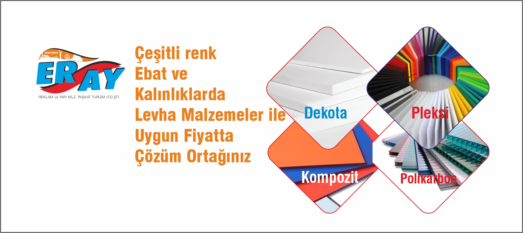 Baskı folyosu, vinil, kağıt ve kumaşlarımızla Dijital Baskı ile ilgilenen iş yerlerinize... Kesim folyosu, dekota, pleksi levhalarımızla açıkhava reklamcılarına, tabelacılara... Polikarbon, kompozit gibi panel malzemelerimizle inşaat sektörüne... Led, adaptör ve daha çeşitli elektrikli ürünlerimizle elektrik işlerine... Display, yönlendirme, duba ve güvenlik ürünlerimizle heryere... HİZMET VERİYORUZ. İç ve dış mekanda reklam adına aradığınız ne varsa, Eray Reklam'da.