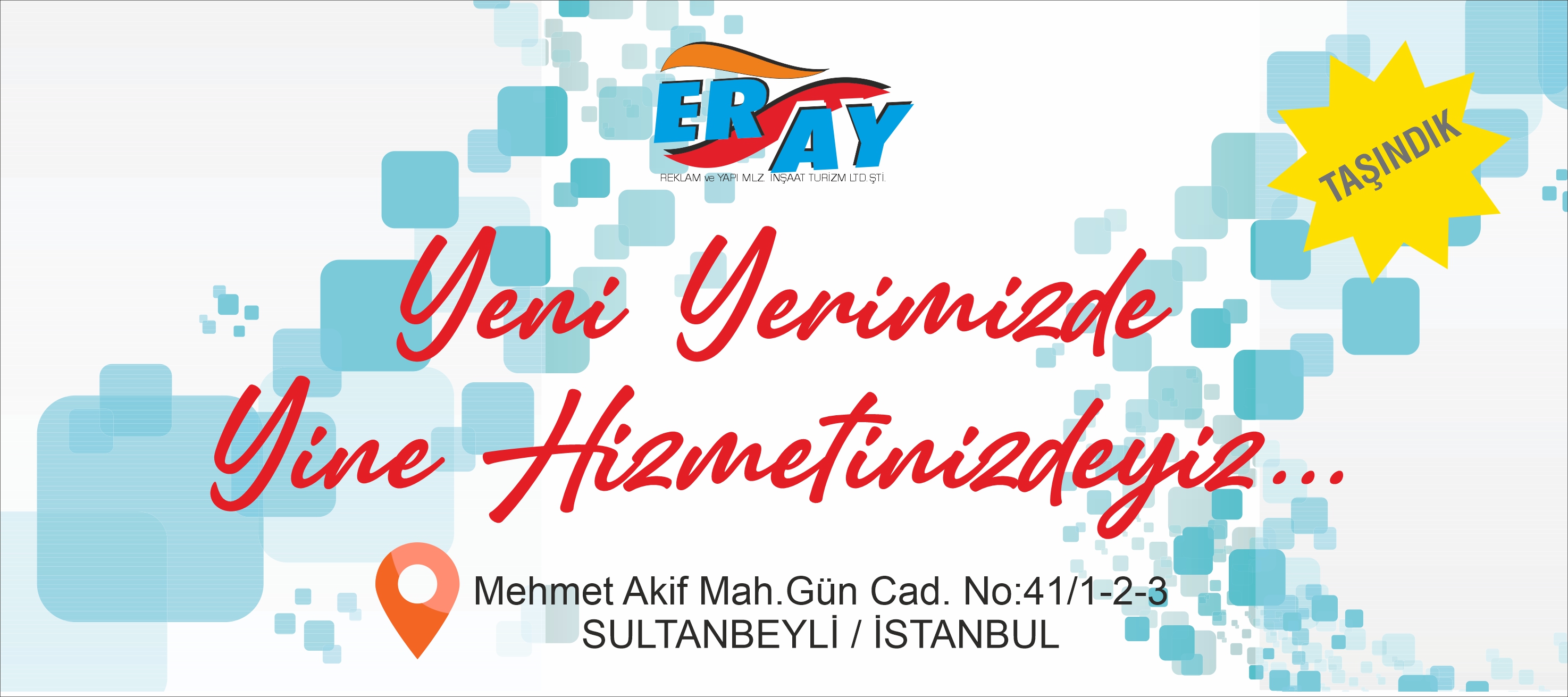 Eray Reklam ailesi olarak, daha geniş bir stokla, size daha iyi hizmet verebilebileceğimiz yeni depomuza taşınıyoruz... İstanbul Avrupa ve Anadolu Yakası ve de İzmit sevkiyatlarımız aynı şekilde gerçekleşmeye devam edecektir. Gecikmeler oluşmaması adına siparişlerinizi bir gün önceden ya da erken saatlerde vermenizi rica ederiz.